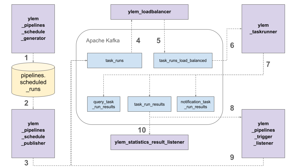 When the time comes to run pipelines the next service **ylem\_pipelines\_schedule\_publisher** (`./backend/pipelines`) reads schedules from the table `pipelines.scheduled_runs`, defines initial task(s) for each pipeline, and sends these tasks to the Kafka-topic `task_runs`.