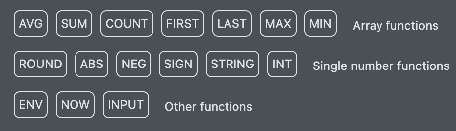 <table><thead><tr><th>Formula</th><th>Meaning</th><th>Example</th></tr></thead><tbody><tr><td><strong>ROUND(field_name, precision, "floor|ceil")</strong></td><td>Round a number up or down with a certain precision</td><td>ROUND(tax, 2, "floor")</td></tr><tr><td><strong>ABS(field_name)</strong></td><td>The absolute value of a number</td><td></td></tr><tr><td><strong>NEG(field_name)</strong></td><td>Inverts the sign of a number. From "-" to "+" and other way around</td><td></td></tr><tr><td><strong>SIGN(field_name)</strong></td><td><p>Returns:</p><pre><code>-1 if d &#x3C;  0