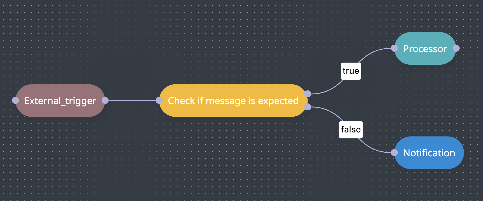 In Ylem pipelines it can be implemented by checking these criteria in the "[Condition](https://docs.ylem.co/pipelines/tasks-ip/condition)" block. For example, in the pipeline below, it checks the criteria and process message if it matches or sends a notification alert to responsive engineers if it doesn't.